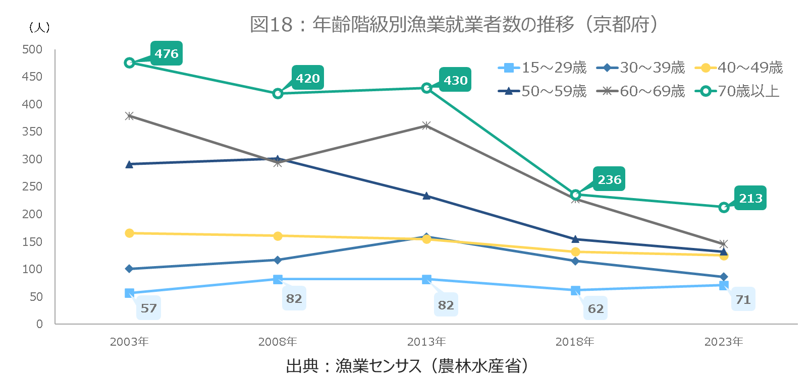 漁業就業者数の推移を年齢別に見てみると、50歳以上の年齢では減少傾向にある一方で、40歳代以下の年齢ではほぼ横ばいとなっています。また2023年の20歳代以下の就業者数は、2003年から約25%増加しており、20年間に漁業就業者の年齢構成に大きな変化があることが分かります。(図18)