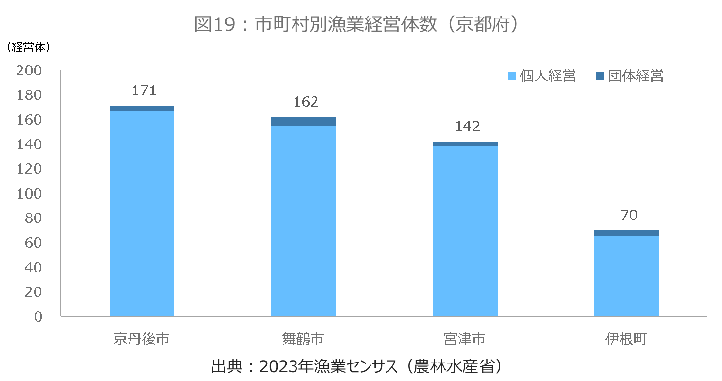 漁業経営体は、京丹後市、舞鶴市、宮津市、伊根町の順に多くなっています。