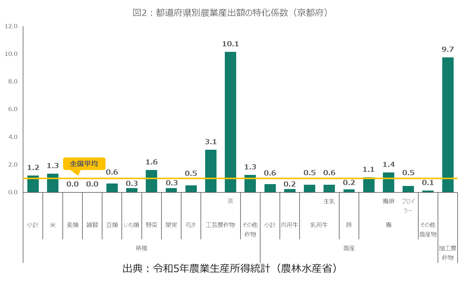 また、産出額の内訳から全国平均を1として算出された特化係数を見ると、「茶(生葉)」及び「加工農産物」の特化係数はそれぞれ10.1、9.7と全国平均と比べて約10倍になっています。(図2)