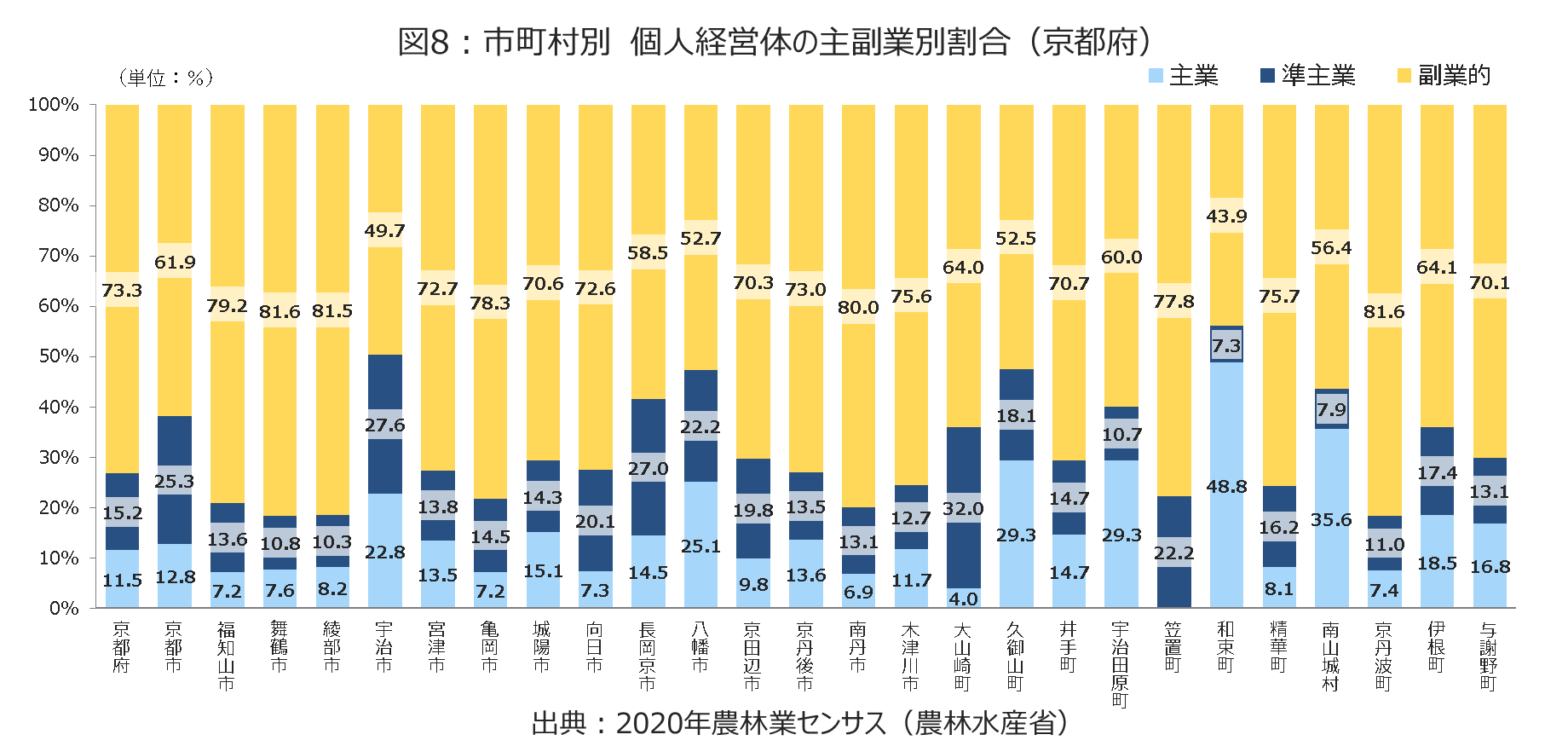 市町村別では、主業経営体割合は和束町(48.8%)、南山城村(35.6%)、久御山町・宇田原町(いずれも29.3%)の順に高くなっており、南部の地域で主業割合が高いことが分かります。(図8)
