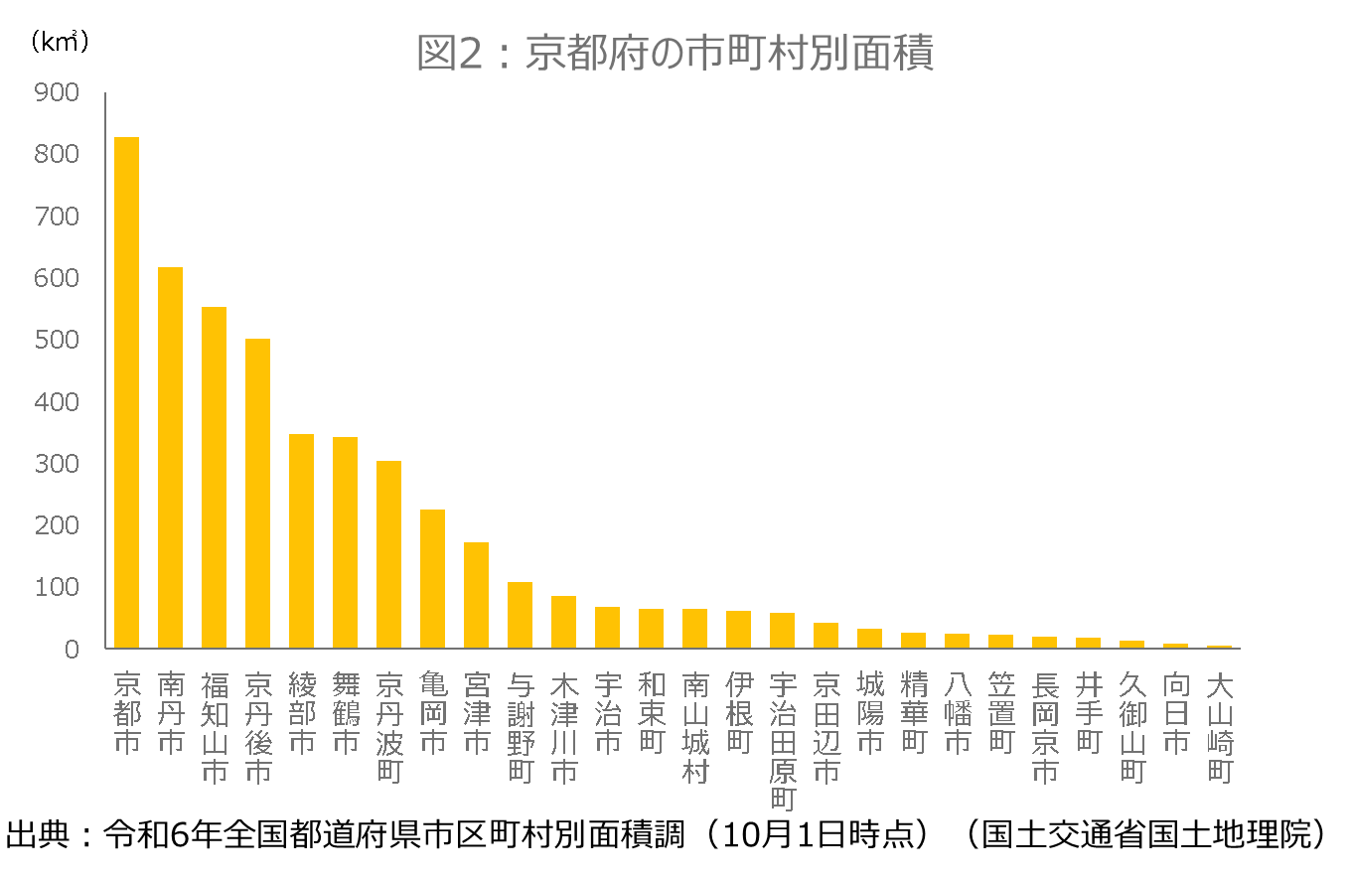 また京都府の市町村別に面積を見ると、京都市、南丹市、福知山市の順に大きくなっており、面積が小さい市町村は南部の市町村が多いことが分かります。(表1、図2)