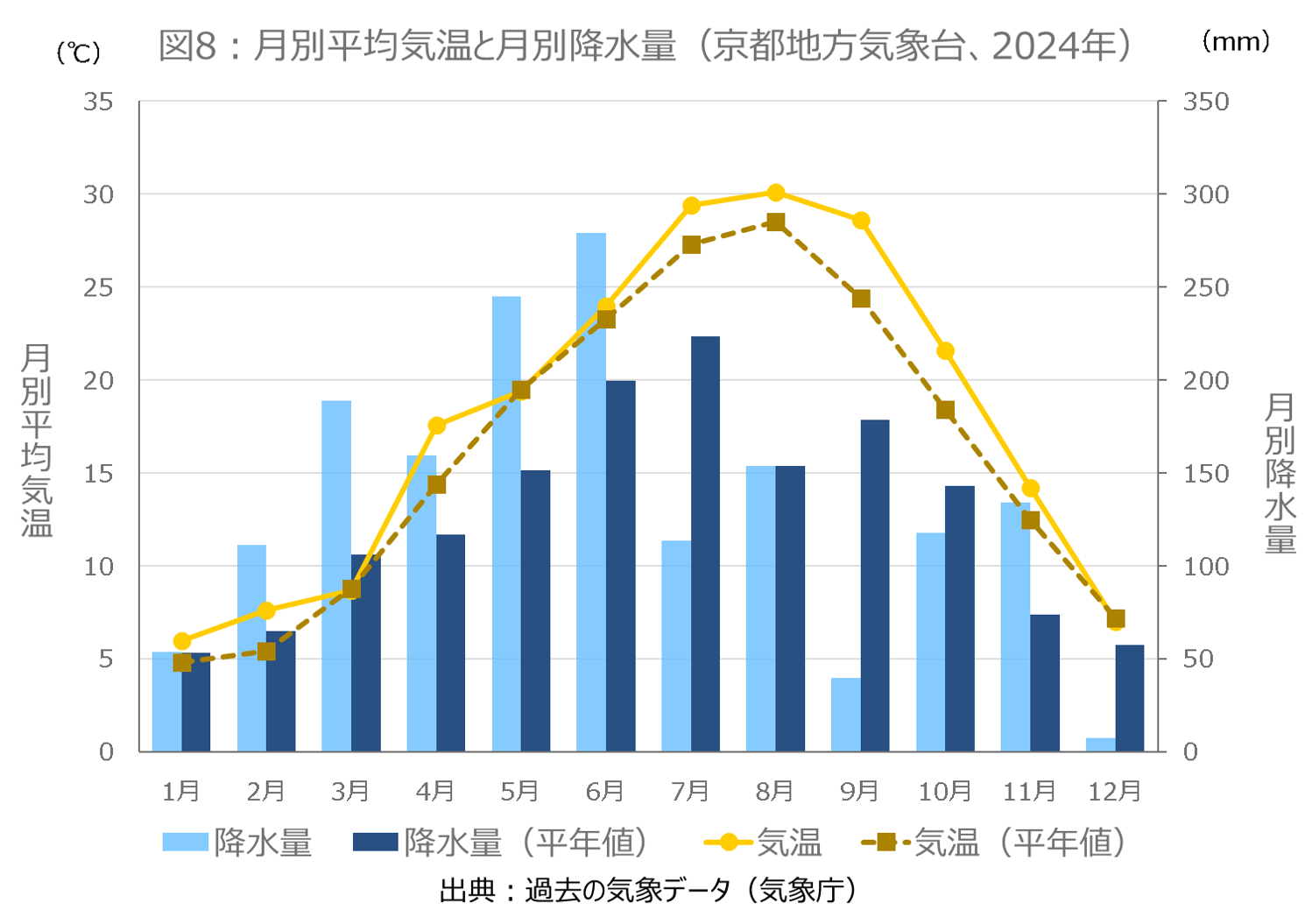 舞鶴と京都の月別平均気温の平年値を比較すると、すべての月で京都が舞鶴を上回っていることが分かります。(図9) また、舞鶴と京都の月別降水量の平年値を比較すると、秋ごろから冬にかけて舞鶴が京都を上回る一方で、6月、7月は京都の降水量の方が多くなっており、4月、5月、8月はほぼ同水準であることが分かります。(図10) |