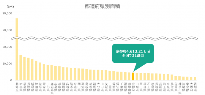また都道府県別に面積を見ると、京都府は全国で31番目の大きさであることが分かります。